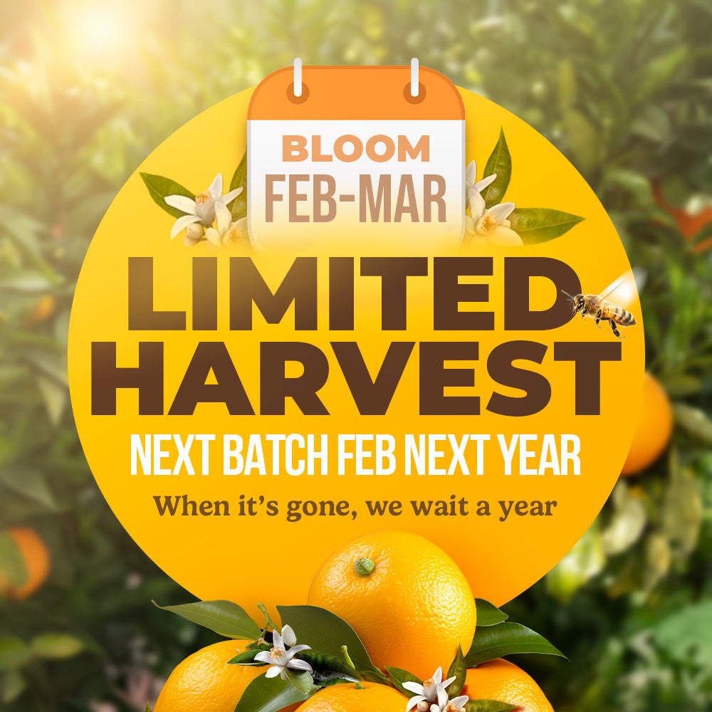 Once a year, in the warm cusp of spring, Mexico’s orange groves burst into bloom, creating a dense, snowy haze of petals that lasts just two to three weeks. This brief floral window, typically unfolding from late March through early April, defines the harvest season for Water White Orange Blossom Honey. Our beekeepers position hives along orchard edges at the first light of bloom, allowing bees to forage almost exclusively on orange blossoms. Once the petals fall and the bloom fades, frames are harvested and the honey is gently extracted, RAW & Unfiltered, never heated, never ultrafiltered, and never altered with additives. The result is one of the palest and most delicate expressions of citrus honey, exceptionally clear, refined, and exactly as nature made it.